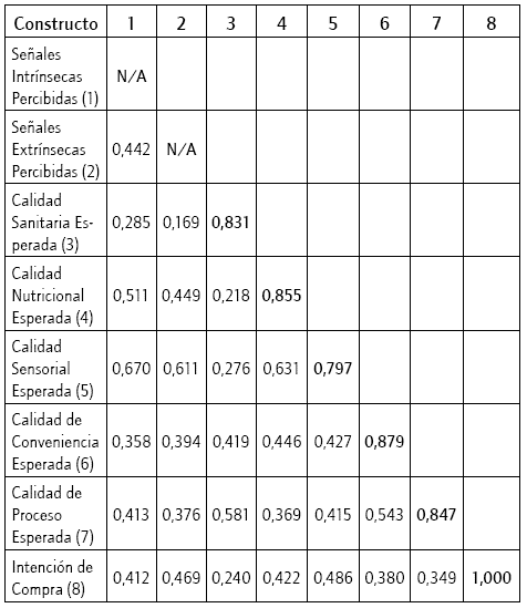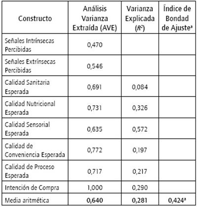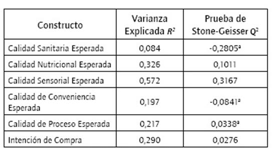 Otra prueba que determina la calidad de predicción del modelo estructural es la prueba de Geisser (1975) o parámetro Q2 (cross validated redundancy). Los valores Q2 de la calidad sanitaria esperada, la calidad de conveniencia esperada y la calidad de proceso esperada están por debajo de cero. En cuanto a los valores Q2 de la calidad nutricional esperada, la calidad sensorial esperada y la intención de compra están por encima de cero, es decir, tienen un poder de predicción satisfactorio (Tabla 8).