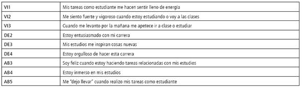 Para el estudio se empleó la escala de engagement UWES-S 9 (Schaufeli et al., 2006), que ha sido usada previamente para medir el engagement académico (Coelho-Martinho y Conde-Pérez, 2013). A partir de la consistencia interna reportada por Schaufeli y Baker (2003), sobre las dos versiones del engagement académico (17 y 9 ítems), la escala de nueve ítems cuenta con mejor consistencia y mayor ajuste de los datos al modelo de tres factores, de allí que haya sido escogida para desarrollar el presente estudio.