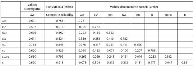 Para comprobar la validez convergente, se examina la varianza media extraída (Average Variance Extracted, AVE), propuesta por (Fornell y Larcker, 1981). El valor que ofrece este indicador informa el porcentaje de varianza que está siendo explicado por los indicadores de cada constructo respectivamente. Los valores ave deben ser superiores a 0,5. Se depura el modelo eliminando ítems hasta que se alcanza este límite crítico en todas las dimensiones, aceptando por tanto la validez convergente. Para aceptar la validez discriminante, cada ave debe ser superior a la varianza compartida entre su constructo y el resto de constructos representados. De esta manera, si el ave es superior a la correlación al cuadrado de ese mismo constructo con cada una de las otras variables, puede aceptarse que cada constructo se relaciona con mayor intensidad con sus propias medidas que con las de las otras variables (Barclay, Higgins y Thompson, 1995). Todas las dimensiones satisfacen las condiciones impuestas, por lo que se acepta la validez discriminante.