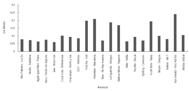 Así, pueden observarse mayores niveles de EDR medio en los anuncios de Ford Ka, Heineken, La Española, Mahou Mixta, Scoth Brite y Sun Herald.