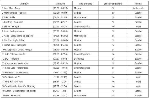 En concreto, los anuncios se concretaron en tipos musical, cómico, cinematográfico, motivacional y dramático. Los idiomas elegidos fueron español, inglés y sin locución.