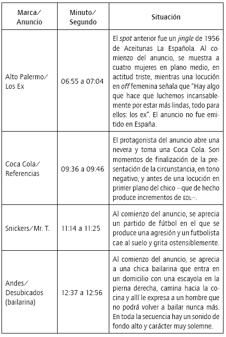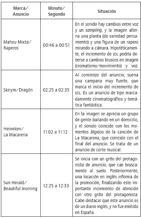 Así, podemos observar que en los cuatro anuncios presentados los momentos que coinciden con decrementos sustanciales de EDL son de contenido negativo o triste. Dicha situación negativa se produce en todos los casos en los momentos iniciales de los anuncios.