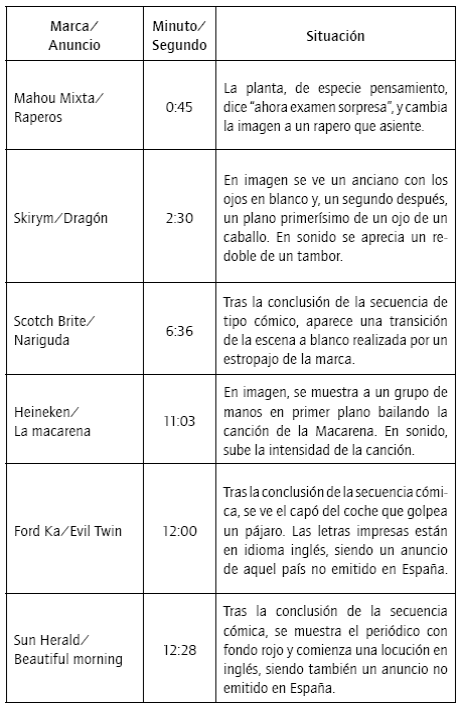 Con independencia de la situación espacial del anuncios, hay que señalar que en aquellas zonas en donde la pendiente de la curva es positiva se observa un aumento de la atención (caso de los anuncios de Mixta, Nocilla, Scotch Brite, La española, Heineken, Ford Ka y Sun Herald); en términos globales, estos son anuncios captadores de atención. En vista de ello, se puede señalar que son anuncios con fuerte componente cómico o musical. También se destaca que una parte de ellos (Scotch Brite, Ford Ka y Sun Herald) no fueron emitidos en España, por lo que la familiaridad de los espectadores con dichos anuncios debería ser nula.