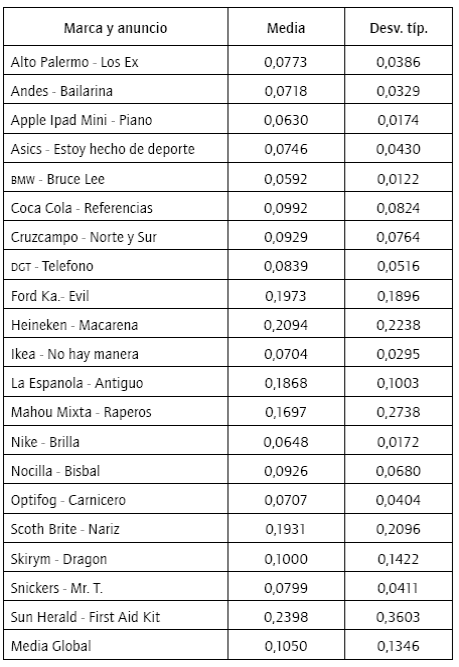 Finalmente, el anuncio de Mahou Mixta obtiene un EDR medio significativamente superior al anuncio de Alto Palermo, Andes, Asics, bmw, Ikea y Nike, pero no al resto. En las pruebas realizadas, el anuncio de La Española no obtuvo un EDR medio significativamente superior a ningún anuncio.