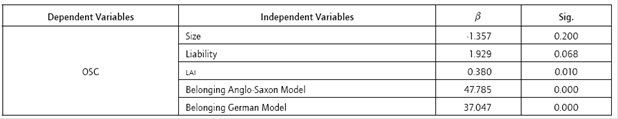 In all models (table 3), the OSC indicator is a critical variable at a 5% significance level. That is, the items related to the operation of the General Meeting, Board of Management and Support Committees explain the probability of belonging to a specific cc model. In addition, we can observe that the variable takes different signs in the studied models. The positive sign (β = 0.17) is typical of the AngloSaxon model, while the negative sign manifests in the rest of the models (β = -0.025 in the German model or β = -0.195 for the French model). Therefore, the unit increases of the OSC indicator lower the probability of belonging to the French and German models.