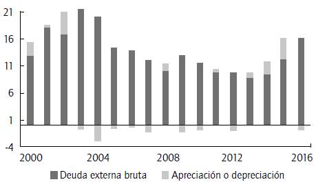En la gráfica 1 se observa el impacto que ha tenido la depreciación en el monto de la deuda del Gobierno Nacional Central (CNC). Entre el 2014 y el 2015, la depreciación del peso frente al dólar explicó en un 55% el incremento en el saldo de la deuda bruta (Ministerio de Hacienda, 2016). El impacto fiscal que tiene la depreciación en la valoración de la deuda externa es inmediato. Además, el cumplimiento de la regla fiscal se ve afectado de manera directa por la depreciación del peso2. El saldo de la deuda pública con respecto al producto interno bruto (PIB) es el principal indicador de la sostenibilidad financiera (SP = SD/PIB), siendo SD el saldo de la deuda pública. En el 2015, la deuda bruta total (externa más interna) del CNC representaba el 43,3% del PIB.