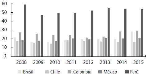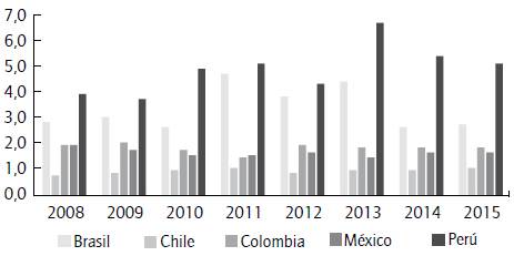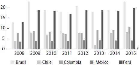 La gráfica 4 compara en varios países la relación entre las reservas y los meses de importación. Los valores más altos son los de Perú y Brasil, que en el 2015 fueron, respectivamente, 20 y 24. Como sucede con los indicadores anteriores, la situación de Colombia es relativamente buena, sin ser la mejor en el panorama latinoamericano.