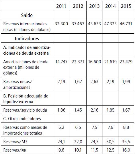 Las reservas también se suelen relacionar con los meses de importaciones (IMP). En la tabla 1 se hace la diferencia entre las importaciones de bienes y las importaciones totales. En el primer caso (importación de bienes), en Colombia en el 2015, la relación RIN/IMP es igual a 10,8. Cuando en el denominador se contabilizan todas las importaciones, el índice es 8,8. Ello significa que, con las reservas disponibles, Colombia podría mantener el ritmo actual de importaciones durante casi 9 meses. El indicador es exigente porque en la realidad, cuando un país tiene problemas de reservas, disminuye las importaciones que no son estrictamente necesarias. Si en el denominador se contemplaran únicamente las importaciones absolutamente necesarias, el número de meses aumentaría.