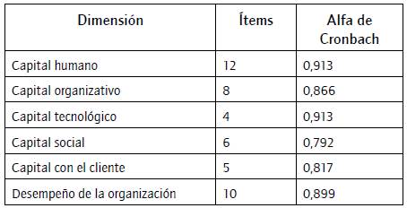 Siguiendo la recomendación metodológica de Bontis (1998), se efectuó un análisis de confiabilidad mediante el alfa de Cronbach para demostrar la validez de los datos y la consistencia interna del cuestionario, que ya habían sido fiables en la prueba piloto; sin embargo, se deseaba garantizar su confiabilidad en rangos que oscilan entre 0,75 y 0,95 (Sharabati et al., 2010). Para ello, se utilizó el programa SPSS versión 22, con el fin de generar los resultados favorables para todas las dimensiones, teniendo un mayor grado de confiabilidad en las dimensiones capital humano y capital tecnológico, mientras que capital social ligeramente superó el umbral mínimo establecido de 0,75 (tabla 2).
