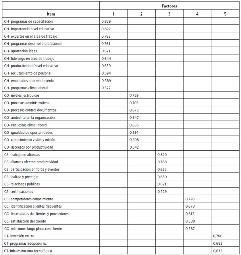 En una primera aproximación, los resultados indicaron que el número conveniente de factores seleccionables era de cinco (tabla 3), contemplando un peso mínimo de 0,500 para ser considerado dentro de un factor, aunque Vallejo (2013) señala que pueden ser considerados pesos o correlaciones superiores a 0,300. Tres ítems fueron descartados del análisis factorial debido a pesos inferiores a los propuestos e, inclusive, al mínimo de 0,300. Dos de los ítems eliminados correspondieron a capital humano y uno a capital tecnológico, lo que da como resultado un total de 32 ítems finales.