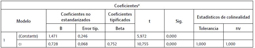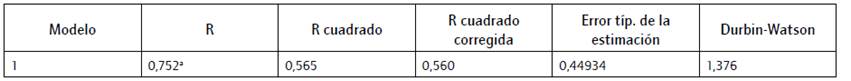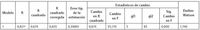 Los diagnósticos de colinealidad efectuados fueron negativos; la tolerancia es baja; de igual manera, el factor de inflación de la varianza (FIV) (entre 1,383 y 2,218) se mantiene en rangos aceptados, lo que permite establecer que los resultados obtenidos son confiables y permiten validar los resultados del modelo de regresión múltiple efectuado.