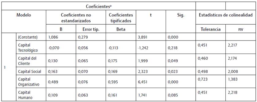 Para comprobar las hipótesis planteadas en este estudio, se hizo uso de la regresión múltiple, tomando como variables independientes el capital humano, social, organizativo, tecnológico y del cliente; por su parte, como variable dependiente se utilizó el desempeño de la organización. En la tabla 4, se puede apreciar el resumen del modelo de la regresión múltiple efectuado, en el que las variables independientes tienen un fuerte poder explicativo -R cuadrado- de 67,4% de la variación sobre la variable dependiente desempeño de la organización. Asimismo, el valor de F es relevante con un nivel de 35,170 (sig. = 0,000). Finalmente, el indicador Durbin-Watson se mantiene por debajo de 2.