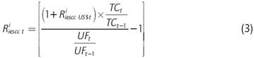 También en los mismos informes trimestrales, la SP publica el rendimiento mensual en dólares de Estados Unidos de las inversiones extranjeras, sin considerar el efecto de la cobertura cambiaria (R¡iescc US$t). De esta forma, si se estima el porcentaje de las inversiones extranjeras con cobertura cambiaria (u¡iecc t ) y el porcentaje descubierto (u¡iescc t ), es posible despejar a partir de la ecuación (2) el rendimiento real mensual en pesos chilenos de las inversiones extranjeras que consideran cobertura cambiaria, R¡iecct, serie fundamental para el posterior análisis comparativo. Sin embargo, es necesario primero convertir el rendimiento mensual en dólares de Estados Unidos de las inversiones extranjeras, sin considerar el efecto de la cobertura cambiaria (R¡iescc Us$ t ), a un rendimiento real mensual en pesos chilenos: