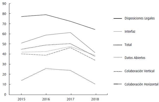 De acuerdo con los datos obtenidos de las cuatro mediciones anuales analizadas, se puede concluir que, si bien existió una evolución positiva durante del 2015 al 2017 en varios de los indicadores, como arreglos institucionales, datos abiertos, colaboración vertical y horizontal, en el 2018 esta evolución cayó a los niveles previos. Todo el avance logrado en los primeros años se eliminó con el resultado más reciente.