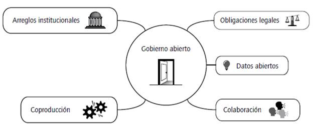Como resultado de una revisión de estudios similares y de la literatura más actualizada sobre el tema, se identificaron cinco componentes para integrar un modelo enfocado para construir el ideal GA: 1) obligaciones legales, 2) datos abiertos, 3) colaboración, 4) coproducción y 5) arreglos institucionales, que pueden observarse en la figura 1.