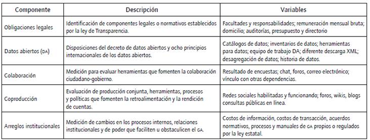 Los componentes descritos -obligaciones legales, datos abiertos, colaboración, coproducción y arreglos institucionales- constituyen el modelo teórico para medir el GA en los portales estatales, con la única excepción de que los componentes vinculados con la normativa, es decir, arreglos institucionales y obligaciones legales, se fusionaron en uno solo que se llamó "Disposiciones legales", pero que incluye ambas perspectivas (Sandoval-Almazán, 2017). Las variables que miden cada componente se resumen en la tabla 1.