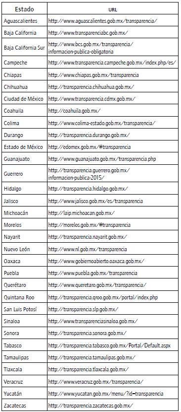 En todos los casos, se visitó la página principal, así como todos los vínculos que aparecieran en ella. Por otra parte, se descargaron los formatos en PDF y se consultaron los informes. Las direcciones electrónicas de los portales analizados se muestran en la tabla 2. La tercera etapa de captura y verificación de datos se realizó alternadamente por dos capturistas que contrastaron sus bases da datos y, luego, se procedió a la ponderación de los componentes.