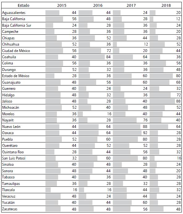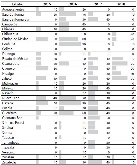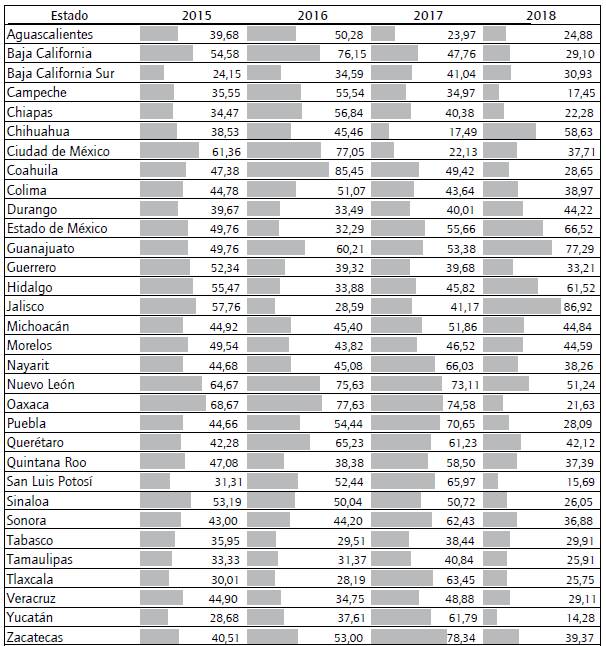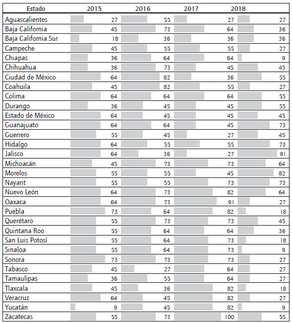 En primer lugar, destaca la comparación global de los datos. Por ejemplo, el 25% de los portales analizados a lo largo de este tiempo describe un comportamiento a la alza (tabla 3). Los estados de Zacatecas, Yucatán, Tlaxcala, San Luis Potosí, Puebla, Baja California Sur y Nayarit han seguido este patrón de comportamiento. No obstante, en el 2018 se observa claramente una fuerte caída en la mayoría de las entidades, salvo en casos excepcionales como Jalisco y Guanajuato; el resto presenta menor puntaje que en los tres años previos.