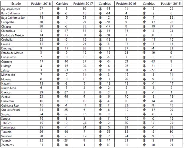 De hecho, gran parte de los cambios a la baja en los estados ocurrieron en la medición del 2018 (tabla 4). Caso contrario ocurre con los estados que ganaron lugares en el 2017, como Chihuahua, mejorando 27 posiciones en el 2018; Tlaxcala, 25 posiciones en el 2017, y Estado de México mejorando 9.