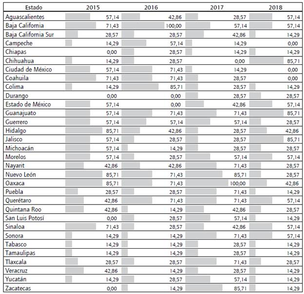 Los datos obtenidos para las disposiciones legales describen una serie de variaciones poco comunes; por ejemplo, en el 2015 el cumplimiento de los indicadores de este componente era mayor a los 60 puntos. Esta tendencia se mantuvo durante el 2016 y el 2017 en Guanajuato y Querétaro, pero la tendencia comienza a cambiar en Oaxaca, Jalisco, Chihuahua, Ciudad de México, Tamaulipas, Nayarit, Tabasco y Baja California. A pesar de ello, la respuesta más común es tener un nivel de cumplimiento de lo dispuesto por la normativa hasta llegar a altos puntajes en este componente; los estados de Veracruz, Michoacán, Tlaxcala y Estado de México son un ejemplo de ello en la medición del 2017. En cambio, dos entidades presentan acciones poco consistentes: el estado de Guerrero sube en el 2016 y cae anualmente en el 2017 y el 2018; el estado del sur de México, Yucatán, obtiene el menor puntaje durante los cuatro años de evaluación, aunque curiosamente la mejor evaluación la obtiene en el 2017 y baja hasta el fondo en el 2018. Esta caída se observa recurrentemente en los estados de Aguascalientes, Baja California, Campeche, Chiapas, Coahuila, Guerrero, Hidalgo, Morelos, Nayarit, San Luis Potosi, Sinaloa, Tlaxcala y Zacatecas.