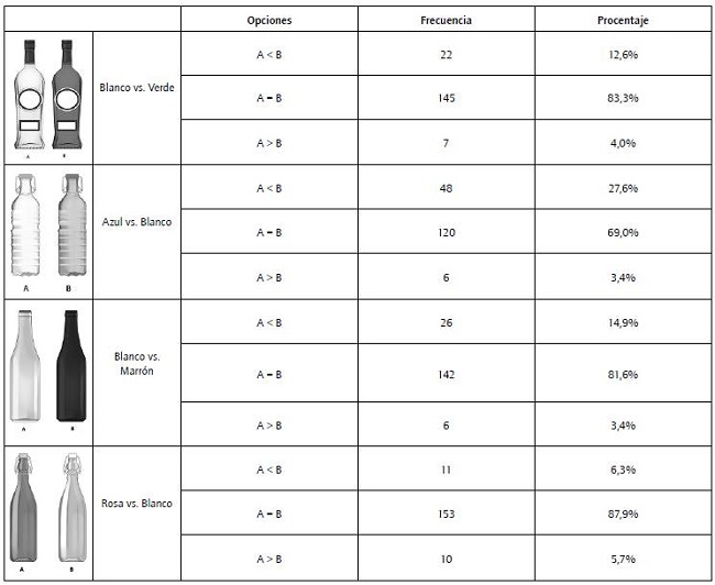 El tercer grupo mostrada una botella blanca y una marrón. En esta ocasión, un 15% de los individuos detectaron diferencias a favor de la de color marrón al obtener un mayor volumen percibido.