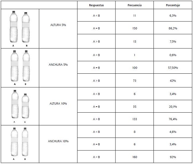 En el primer grupo mostrado hay una modificación de un 5% en la altura: la botella A era la original y la B tenía el 95% del tamaño original. En este caso el 86,2% de los individuos declaró que las dos botellas tenían el mismo volumen, es decir, no percibieron diferencia alguna.
