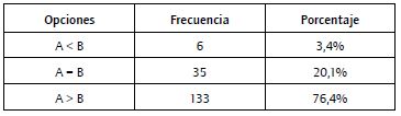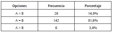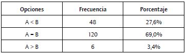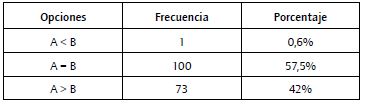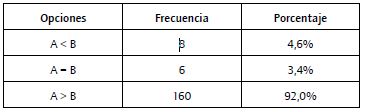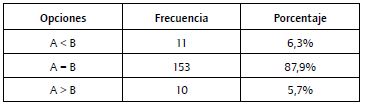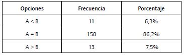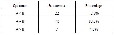 Los análisis utilizados se basan en una comparación de frecuencias entre los valores "mayor que", "igual" y "menor que". La razón de la utilización de opciones dicotómicas en lugar de escalas de valoración responde a que estas permiten una respuesta más espontánea, especialmente en los casos en los que las reducciones eran muy pequeñas (5%) y, por tanto, difíciles de detectar o medir.