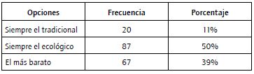 La tercera y última sección de preguntas del cuestionario recogía la predisposición a pagar un envase ecológico. Las posibles respuestas eran: "siempre el tradicional", "siempre el ecológico" o "el más barato". Para presentar esta última sección se utilizó una foto de envase ecológico sin marca, muy común en el mercado, con el fin de que los encuestados pudieran tener una idea clara del ecopackaging. En este caso se trató del envase de gel y no de bebidas como en el resto del cuestionario, ya que, si bien en el caso de alimentos y bebidas la mayoría de los envases presentes en el mercado son reciclables, el utilizado tenía otras características importantes como su reutilización y el uso de materiales con menor impacto en el medio ambiente.