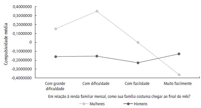 Importante ressaltar que esse fenômeno não foi verificado no público masculino, em que dificuldades financeiras na família e consumo compulsivo não atingiram padrões aceitáveis de significância estatística nos testes de correlação, conforme visto na tabela 5. O cenário exposto pode ser mais um sinal de que as preocupações e dificuldades financeiras familiares seriam razões para o comportamento de compras compulsivo entre as mulheres. O gráfico 1 apresenta as diferenças do relacionamento entre dificuldades financeiras familiares e consumo compulsivo entre os gêneros.