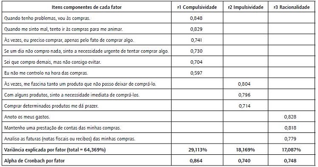 A escala apresentou boa consistência interna e, assim como na pesquisa original (Luna e Giménez, 1998), resultou em três fatores: compulsividade, impulsividade e racionalidade. Foram retirados os itens 1, 8, 9, 10, 11 e 15 por apresentarem padrões abaixo do recomendado em co-munalidades e, dessa forma, garantir uma maior robustez estatística aos construtos (Hair et al, 2009). O Alpha de Cronbach, medida que traduz a confiabilidade de uma escala, obteve índices adequados para cada fator (Gallarza et al, 2016).