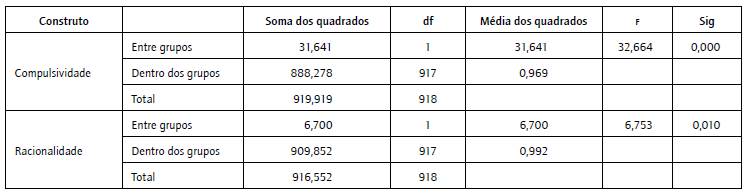 Executada a AFE e identificados os construtos latentes, foi realizado o teste anova para verificar a existência de diferenças nos comportamentos de consumo em relação aos traços demográficos da amostra. Constatou-se que há diferenças significativas nas atitudes compulsivas e racionais de consumo entre homens e mulheres, conforme sumarizado pelas tabelas 2 e 3. Para impulsividade, não foram encontradas evidências da existência de desigualdades nesse comportamento em relação ao gênero do respondente.