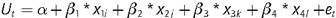 En la expresión 2, U(envase)i representa la utilidad del nivel i para el atributo tipo de envase; U(certificación)¡, la utilidad del nivel para el atributo certificación; U(origen) k, la utilidad del nivel k para el atributo origen regional, y U(precio)l, la utilidad del nivel l para el atributo precio de producto. Por lo tanto, la representación econométrica del modelo conjunto es la siguiente: