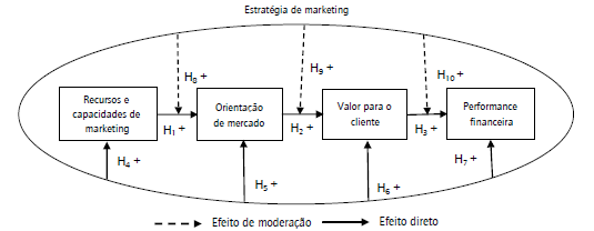 O processo de formulação e implementação estratégica abrange um amplo domínio, para além dos objetivos do presente trabalho. Apoiamo-nos, portanto, no quadro conceptual destinado a orientar o pensamento estratégico proposto por Cravens, Piercy e Baldauf (2009), que sugerem que recursos e capacidades de marketing, orientação de mercado e valor para o cliente estão relacionados entre si. Para além disso, as decisões relativas a estas variáveis devem permitir a avaliação do respetivo impacte em termos financeiros (Atman, Heerde e Mela, 2010). Em função do exposto, consideramos as seguintes hipóteses: