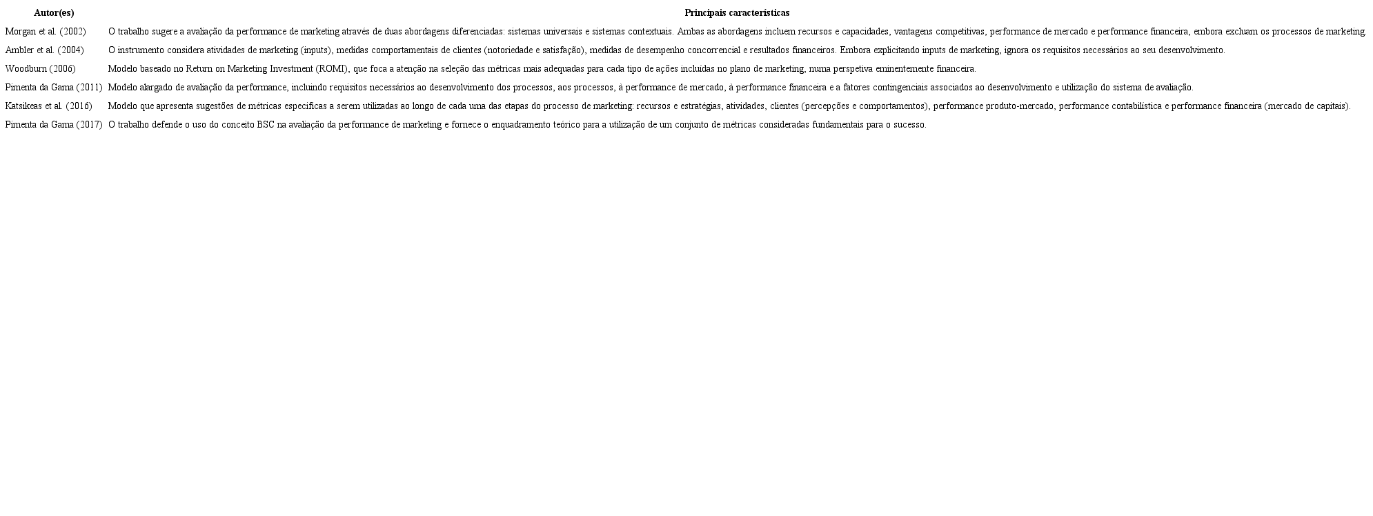 Apesar da proliferação das medidas isoladas de desempenho, financeiras e não financeiras (Farris, Bendle, Pfeifer e Reibstein, 2017; Uzma, 2018), a performance de marketing como um todo, traduzível num instrumento universal e fiável através da qual o mérito da respectiva atuação possa ser avaliado, tem recebido atenção limitada na literatura. Mesmo assim, é possível identificar, desde a última década, alguns trabalhos de modelização da performance de marketing (Ambler, Kokkinaki e Puntoni, 2004; Katsikeas et al., 2016; Morgan et al., 2002; Pimenta da Gama, 2011, 2017; Woodburn, 2006), embora sem validação empírica. Na Tabela 1, apresentamos cronologicamente e caracterizamos sumariamente cada um destes trabalhos.
