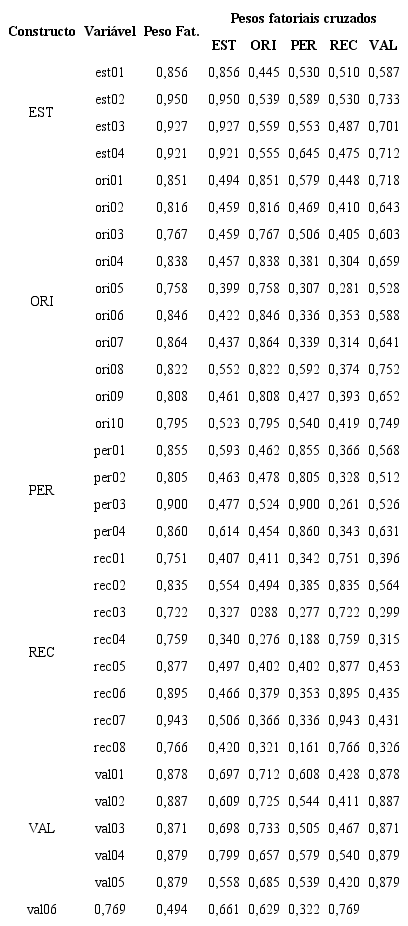 Todos os indicadores do modelo de medida são significativos, com os pesos fatoriais (0,722 até 0,950) superiores a 0,70 (Sarstedt, Ringle e Hair, 2017), o que demonstra fiabilidades individuais dos itens adequadas (Tabela 3). A validade convergente foi medida através da Variância Média Extraída (VME), da Fiabilidade Composta (FC) e do alfa de Cronbach. Todas as medidas demonstram a existência de validade convergente (Tabela 4), dado que todos os valores de FC, VME e alfa são superiores a 0,60, 0,50 e 0,80, respetivamente (Sarstedt et al., 2017). A validade discriminante foi avaliada por meio do critério de Fornell-Larcker (como citado em Wong (2016)), do rácio Heterotrait-Monotrait (HTMT) e da análise dos pesos fatoriais cruzados (Henseler, Ringle e Sarstedt, 2015). Todos os indicadores confirmam a existência de validade discriminante: a raiz quadrada da VME em qualquer uma das colunas relativas a cada um dos constructos é superior à correlação entre esse constructo e os restantes (Tabela 4); todos os rácios HTMT são inferiores a 1,0 (Tabela 5); todos os pesos fatoriais de uma variável associados a um constructo são superiores aos pesos fatoriais dessa variável com os outros constructos (Tabela 3). Uma análise complementar aos Fatores de Inflação da Variância (FIV) revela valores com variação de 1,0 a 2,8, inferiores ao valor de referência de 5 (Hair et al., 2017), pelo que a multicolinearidade entre as variáveis não constitui obstáculo aos testes estatísticos subsequentes.