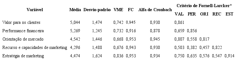 Para efeitos de teste das hipóteses de investigação, os coeficientes dos caminhos estruturais foram calculados através da técnica de bootstrapping, com 500 reamostras (Tabela 7). A hipótese H1, que afirma que os "Recursos e capacidades de marketing" estão positivamente relacionados com a "Orientação de mercado", é suportada (β = 0,209, t-value = 2,372), assim como é confirmado o efeito positivo (H2) da "Orientação de mercado" para o "Valor para o cliente" (β = 0,471, t-value = 8,664). Também é confirmada a hipótese H3 que preconiza uma relação positiva entre "Valor para o cliente" e "Performance financeira" (β = 0,333, t-value = 2,498). As hipóteses que preveem uma relação positiva entre “Estratégia de marketing” e (i) “Recursos e capacidades de marketing” (H4: β = 0,546, t-value = 8,146); (ii) “Orientação de mercado” (H5: β = 0,444, t-value = 4,148); (iii) “Valor para o cliente” (H6: β = 0,448, t-value = 7,408) e (iv) “Performance financeira” (H7: β = 0,327, t-value = 2,520) são igualmente suportadas.