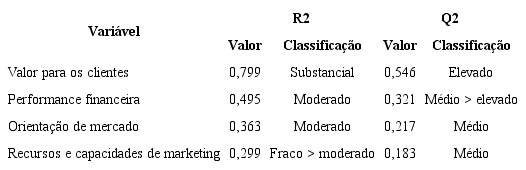 Para avaliar a capacidade preditiva do modelo, utilizou-se do indicador Q2. Como todos os valores de Q2 são maiores que zero (Tabela 6), pode-se concluir, com a utilização dos valores de referência indicados por Cohen (como citado em Garson, 2016), que o modelo tem uma relevância preditiva média a elevada.