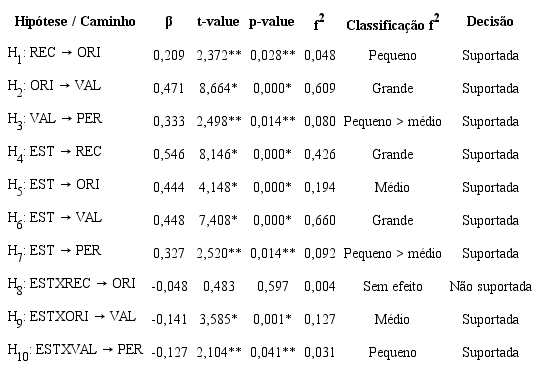 O primeiro critério utilizado para avaliar o modelo estrutural é o coeficiente de determinação (R2), o qual representa a quantidade de variância explicada de cada variável latente endógena (Sarstedt et al., 2017). De acordo com a Tabela 6, as variáveis REC, ORI, VAL e PER apresentam valores entre 0,299 e 0,799, estando em conformidade com o critério de R2 > 010 (Sarstedt et al., 2017). Como regra básica, o R2 pode ser classificado como fraco (0,19), moderado (0,33) e substancial (0,67) (Sarstedt et al., 2017). Neste estudo, o R2 da maior parte das variáveis endógenas assume um perfil de moderado.