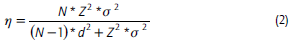 De esta forma, para un N = 162, la desviación estándar (σ) fue de 21,2 y la varianza σ2 de población fue igual al 450,7, con un error (d) del 8%, para un nivel de confianza del 95%, dando como resultado, una muestra representativa de r = 24.