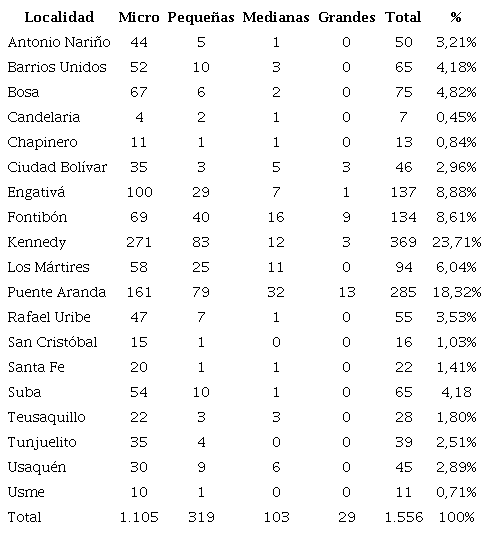 Es así como se estableció un criterio de distribución espacial de las empresas del clúster de plásticos en Bogotá, para las categorías CIIU 4 (DANE, 2012), C2221 y C2229, cuyas matrículas mercantiles estuvieran vigentes para el 2015 y el 2016. Se identificó, en primer lugar, la cantidad de compañías en cada una en las 19 localidades urbanas en las que está distribuida la ciudad (tabla 3). La localidad que más concentra empresas del tipo objeto de estudio es Kennedy (n.° 08) con 369, lo que equivale al 23,71%% sobre el total de 1.556 unidades productivas. Se destaca que la mayoría de estas unidades productivas corresponde a microempresas.