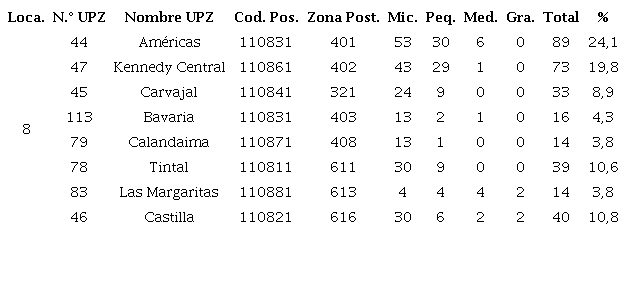 Posteriormente, se analizó la distribución de las empresas sobre las respectivas UPZ y se determinó su localización bajo un esquema codificado de georreferenciación, de acuerdo con las coordenadas de código y zona postal, utilizando el Sistema de Información de Norma Urbana y POT (Sinupot)2, de la Secretaría de Planeación del Distrito Capital. Esto dio como como resultado que el 43,9% de las 369 empresas identificadas se posiciona espacialmente en dos zonas puntuales de la localidad de Kennedy, la 401 y 402, con 89 y 73 empresas respectivamente (tabla 4).