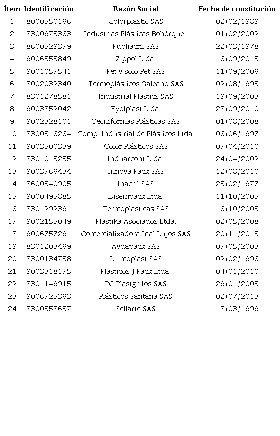 Posteriormente, se hizo una selección aleatoria y representativa de las empresas del sector de plásticos en Bogotá, vinculando el número de orden dado por el DANE (2015) en la EDIT con una correlativa obtenida de la Encuesta Anual Manufacturera (EAM), tomando como año base el 2003 correspondiente a la EDIT II, para garantizar la trazabilidad completa a lo largo de la serie de tiempo del estudio.