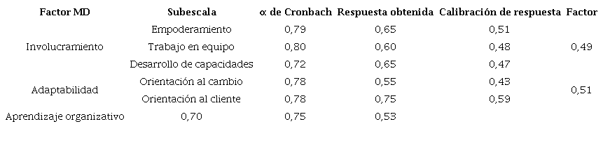 El diseño del instrumento presenta una serie de bondades que le confieren una estructura sólida idónea para indagar el comportamiento organizacional, a partir de una revisión de la cultura de las empresas. En este sentido, los ítems del cuestionario manejaron una correlación positiva de nivel intermedio de 0,57 entre ítems, con coeficientes de correlación entre factores y subescalas estadísticamente significativos de 0,01 con los bloques de preguntas, lo que le otorgó una fiabilidad mediante índice alpha de Cronbach de 0,90 para el factor de involucramiento y de 0,87 para el factor de adaptabilidad, presentando un balance del Modelo Denison.