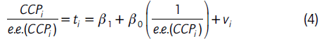 Esta regresión se conoce como "prueba de Egger" de asimetría (Egger et al., 1997), y permite medir tanto la asimetría de la distribución (prueba FAT9), como efectuar el análisis del "efecto genuino" (prueba PET10) a partir del nivel de significación de los coeficientes estimados. La ausencia de asimetría se postula bajo la hipótesis nula H0) β1=0 y la ausencia de un efecto genuino bajo la hipótesis nula H0) β0 =0. Puesto que se espera que el error estándar de los efectos de tamaño no sea la misma para cada estudio, el término de error resulta heterocedástico. Por ende, debe estimarse vía mínimos cuadrados ponderados, utilizando como ponderador al error estándar la siguiente ecuación:
