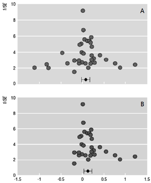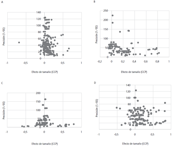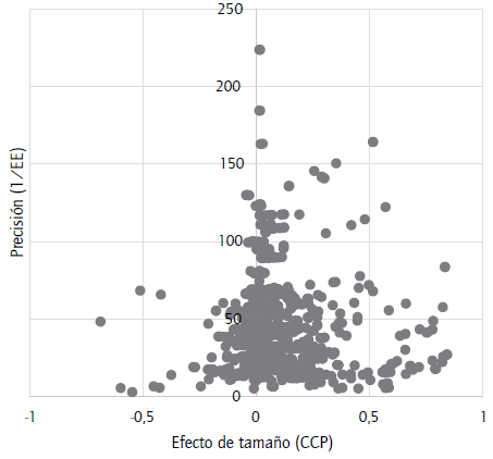 Estos gráficos de embudo o funnel plots son diagramas de dispersión que muestran el valor del efecto de tamaño en función de su nivel de precisión (Stanley, 2005; Stanley & Doucouliagos, 2012; Sterne & Egger, 2001). La precisión del efecto, en términos prácticos, se refiere al error estándar, la varianza o el tamaño muestral relativos al coeficiente (Sterne & Egger, 2001; Sterne et al., 2011). En estos gráficos es posible identificar valores extremos y caracterizar la distribución de los efectos de tamaño y el grado de heterogeneidad entre ambos (Stanley & Doucouliagos, 2012). De existir un efecto de tamaño representativo de la relación estudiada, se espera que los efectos más precisos se concentren alrededor de dicho valor.