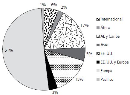 En cuanto al ámbito geográfico de los datos que utiliza cada estudio, puede verse en la figura 2 que más del 50% de estimaciones son para Europa, y el 70% corresponde a países desarrollados13. Del 30% restante, un 25% corresponde a países emergentes, dado que el 5% de estudios "internacionales" utilizan bases de datos que incluyen empresas en diferentes países, generalmente desarrollados. Esta discrepancia no sorprende, puesto que en países emergentes tanto el estudio de estos temas como el diseño de encuestas nacionales de innovación es posterior al de los países desarrollados14, al tiempo que la continuidad en el relevamiento de estas encuestas ha sido mucho mayor en estos últimos.