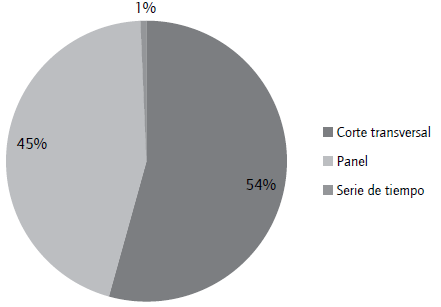 La figura 2 muestra la estructura de los datos empleados para modelar. En primer lugar, se observa que solo un 1% de las estimaciones provienen de series temporales, repartiéndose la muestra en estimaciones con datos de corte transversal (54%) y datos de panel (45%). La continuidad de las encuestas de innovación europeas y el registro de patentes, que permite asignar la innovación a la empresa, explican una gran parte de los datos de panel. La otra mitad de la muestra consiste mayoritariamente en encuestas construidas ad hoc, análisis de una onda puntual de una encuesta de innovación o bases de datos que indagan tangencialmente sobre temas de innovación y hacen foco en otros asuntos.