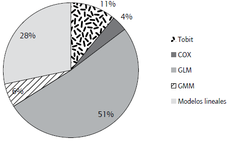 Para finalizar la descripción, se presenta la distribución de los diferentes tipos de modelos econométricos de los que surgen las estimaciones (figura 6). La preponderancia de los modelos lineales generalizados -CLM- (51%) es consecuencia de la modelación de las variables binarias en formulaciones logit y probit, así como la modelación de variable de conteo en modelos log-lineales. Le siguen en orden de importancia los modelos lineales para variables continuas (28%) y los modelos bietápicos que proponen corregir el sesgo de selección (11°%). El resto de la muestra (10%) consiste en estimadores que surgen de la aplicación de otros modelos (COX y método de los momentos generalizado [CMM]).