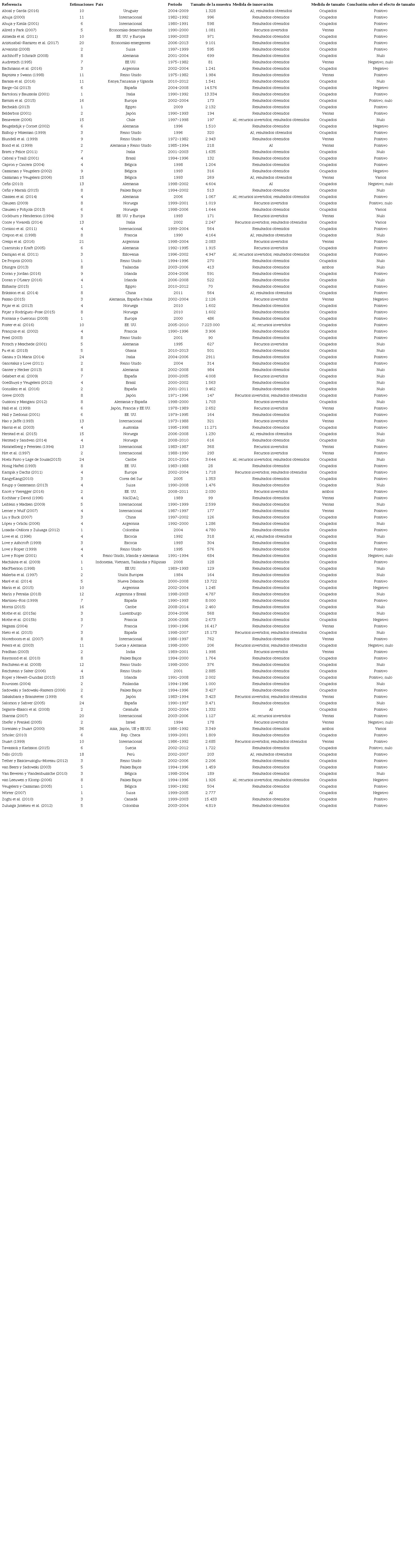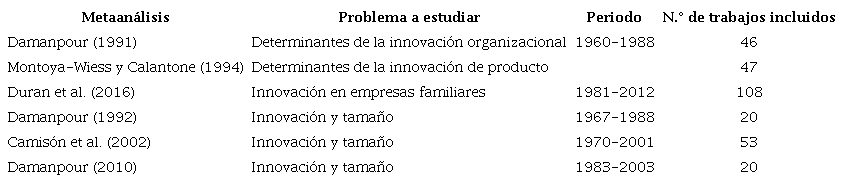 La persistencia de estas disparidades ha motivado varios trabajos en el campo de la innovación en general (Damanpour, 1991; Duran et al., 2016; Montoya-Weiss & Calantone, 1994) y del problema de la relación del tamaño de la empresa con su DI en particular (Camisón et al., 2002; Damanpour, 1992, 2010) mediante técnicas de metaanálisis (tabla 1). El horizonte temporal de estos últimos dos antecedentes cubre hasta principios de la década del 2000, por lo que un primer aporte de la presente investigación es efectuar el análisis con publicaciones más recientes.