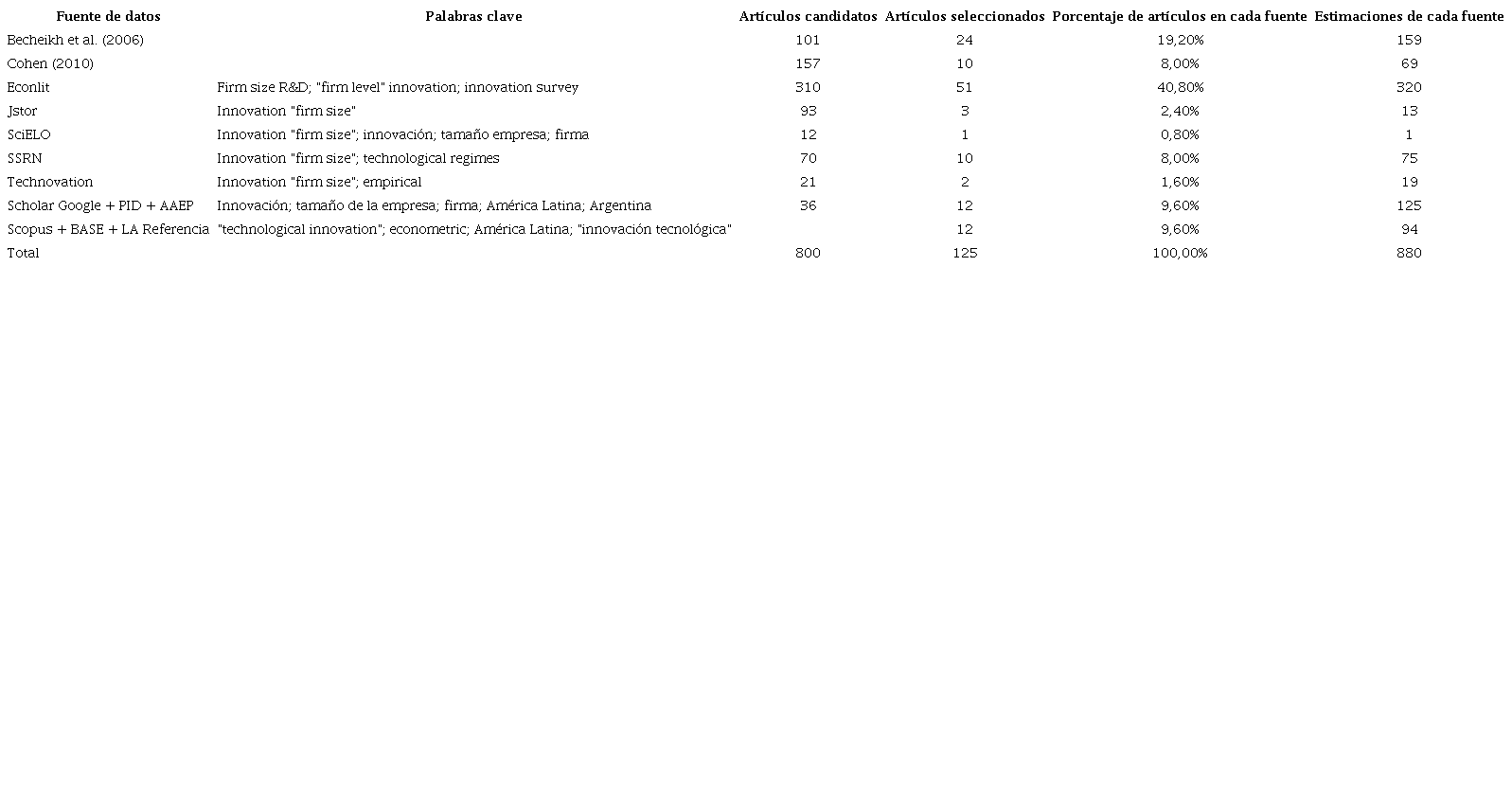Con los criterios antes expuestos, se procedió a buscar en las bases de datos de la American Economic Association (Econlit), Jstor, SSRN y SciELO. Se consultó además el archivo de la revista Technovation, por considerarse de referencia en el tema. Para garantizar la representatividad de la literatura de América Latina, se buscó específicamente en Scholar Google aquella literatura para los países de la región. Finalmente, para la evidencia en Argentina se revisaron los Anales de la Asociación Argentina de Economía Política, de la revista PyMEs, Innovación y Desarrollo y actas de congresos. En una segunda instancia, se consultaron las bases de Scopus y los repositorios institucionales Bielefeld Academic Search Engine (BASE) y LA Referencia7. A continuación, se resumen las principales características de la búsqueda. Una síntesis se presenta en la tabla 2.